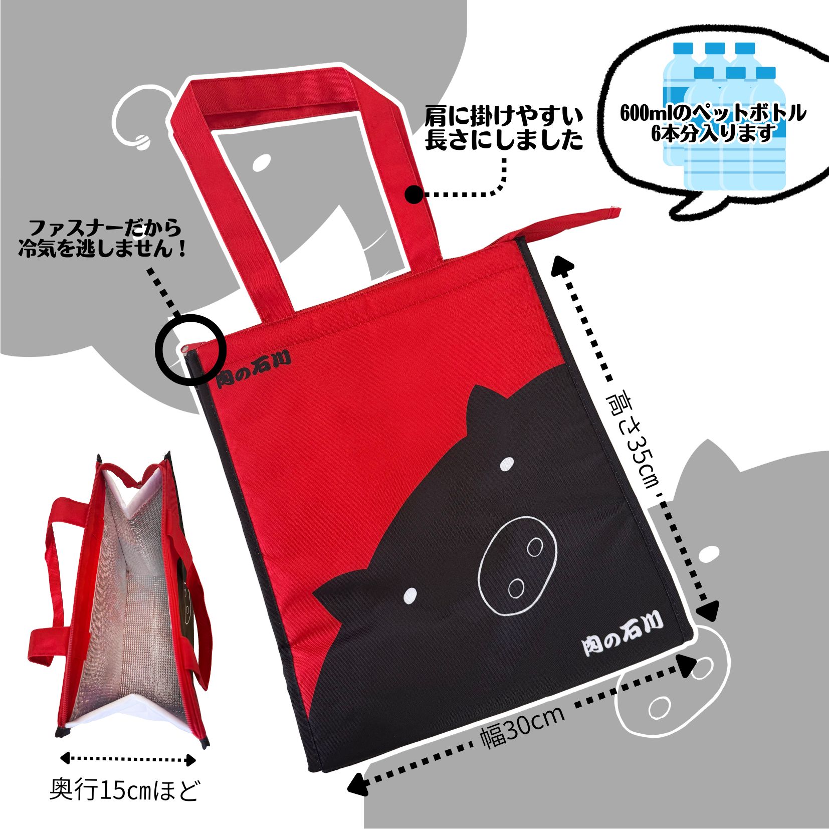上品な赤色をベースにした保冷バッグに、肉の石川の販売店で使用している牛さんと豚さんのイラストを裏表に印刷しました。